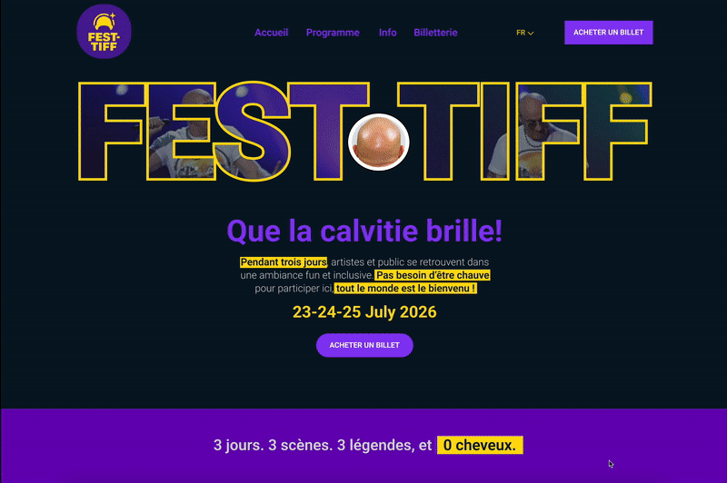 Après la validation des wireframes, j’ai créé un prototype haute fidélité pour représenter le design final du site Fest’Tiff. Ce prototype inclut les couleurs, les images, la typographie et les boutons interactifs. L’objectif était de simuler une expérience proche d’un vrai site web. Le prototype hi-fi permet de tester la navigation, la lisibilité et les appels à l’action. Il aide à vérifier que l’interface est claire, cohérente et agréable pour l’utilisateur.