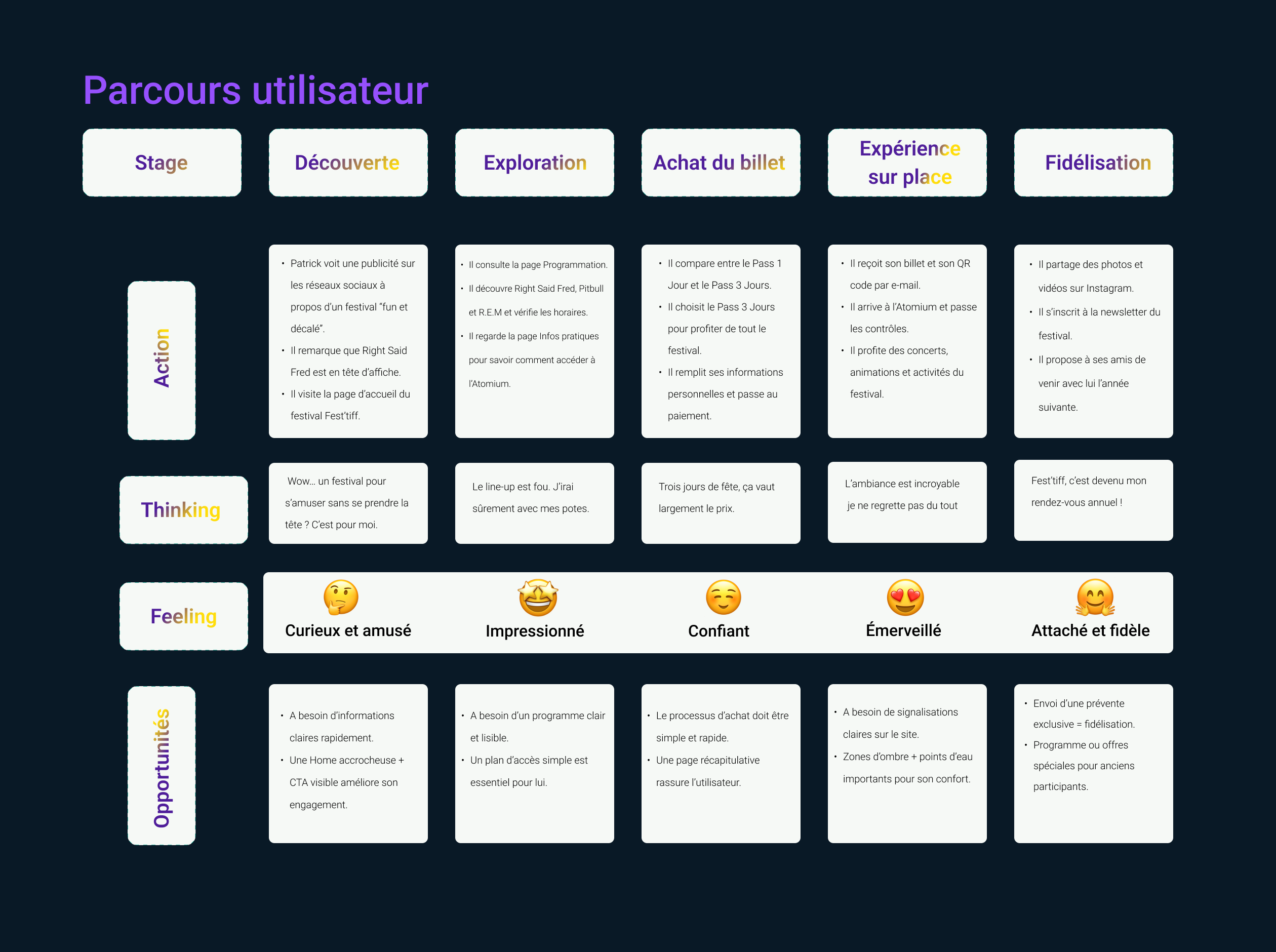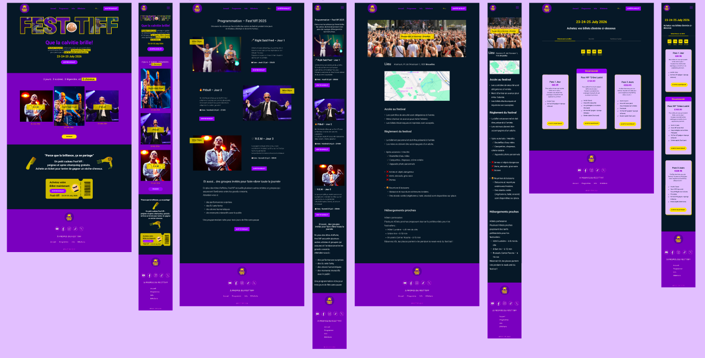 Ce projet m’a permis de comprendre l’importance du design centré sur l’utilisateur.Chaque étape, du parcours utilisateur au prototype haute fidélité, a aidé à créer une expérience claire et agréable.Le site Fest’Tiff combine une identité forte avec une navigation simple et efficace.