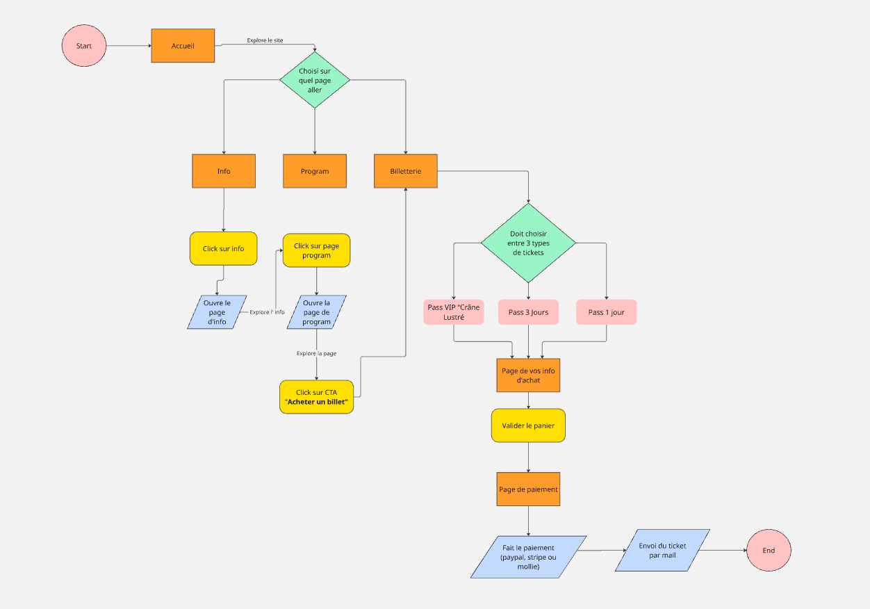 Le User Flow montre les étapes principales que l’utilisateur suit sur le site pour atteindre son objectif.