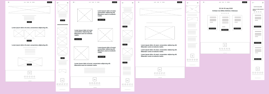Après le User Flow, j’ai créé des wireframes de basse fidélité pour organiser le contenu et la navigation du site.
